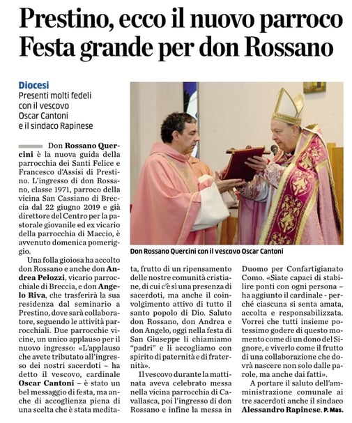 Don Rossano Quercini é nominato parroco anche della Parrocchia dei Santi Felice e Francesco d'Assisi in Como-Prestino e responsabile della Comunità Pastorale di Breccia e Prestino.